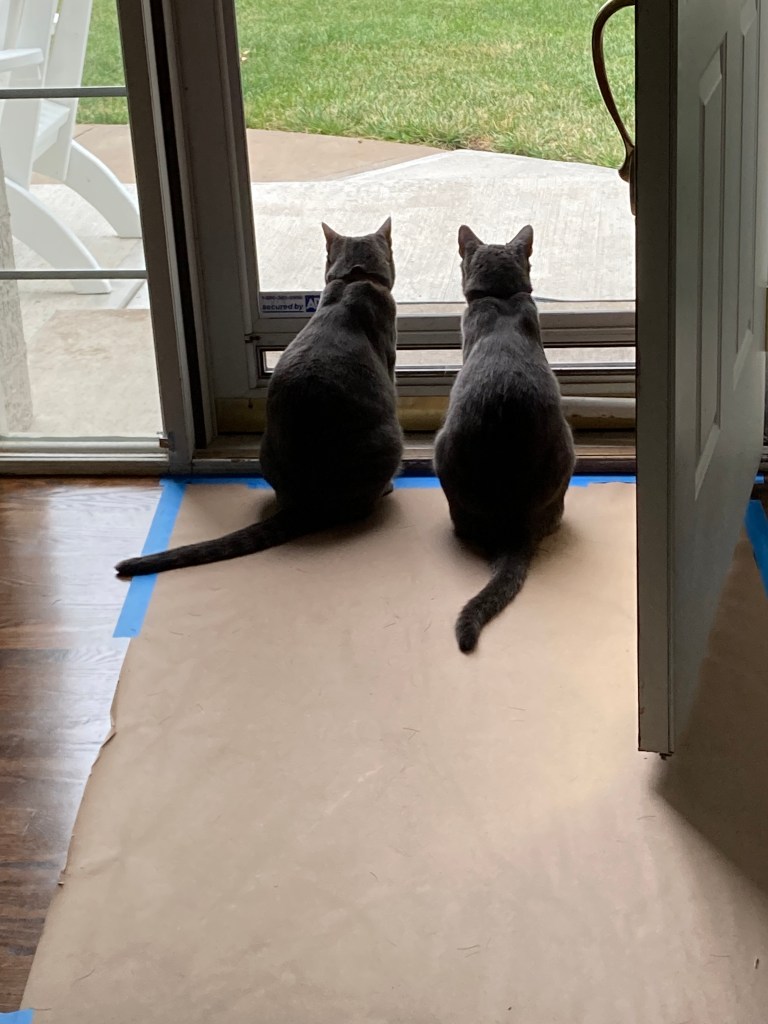 These two cannot understand why, when the world is sitting right there on the other side of that door, they cannot go out and explore it like they always did in small town USA. Why? Could it possibly be that when the unknown neighbor called last week to inform us she had broken up an almost fight between Banana and sly ol’ fox, it was a huge warning sign that Banana and Split must now become indoor only cats? Could it possibly be that when we let Banana and Split out to get some fresh air, they decide fresh air is much more pleasant than the smell of lacquer and paint and refuse to come when called? Hmmmm.